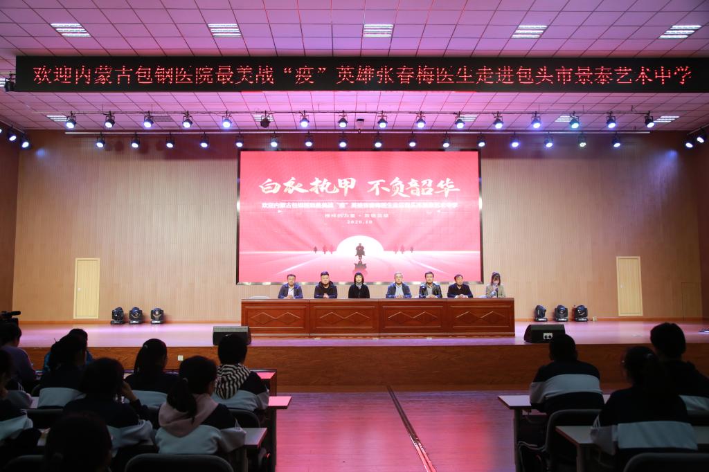 10月20日下午,我院援鄂抗疫醫(yī)生張春梅受邀到包頭景泰藝術(shù)中學(xué)進(jìn)行抗疫事跡宣講,通過現(xiàn)場分享、現(xiàn)身教育,傳遞榜樣力量。景泰藝術(shù)中學(xué)的校領(lǐng)導(dǎo)、我院院長王凌峰、醫(yī)院辦公室主任李俊亮、眼科主任辛向陽以及師生共400余人參加了宣講會(huì)。