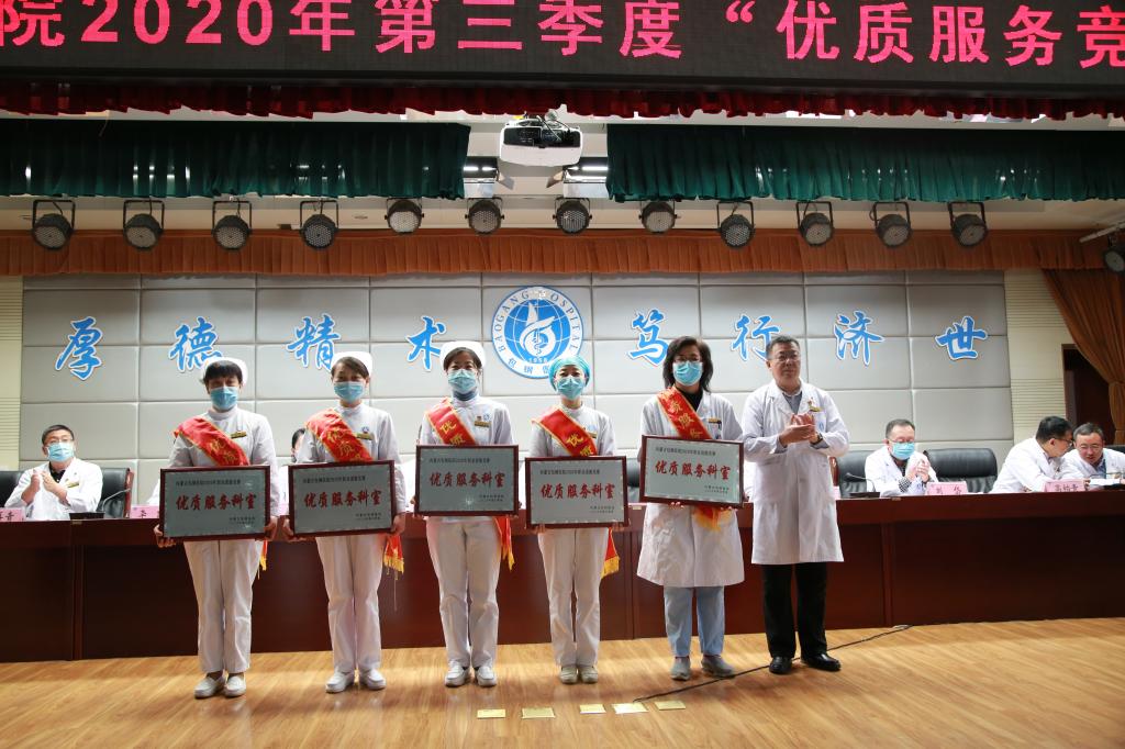 會上,黨委副書記、紀(jì)委書記、工會主席朱永蒙宣讀了《關(guān)于表彰2020年第三季度“優(yōu)質(zhì)服務(wù)競賽”先進集體和個人的決定》。其中,呼吸與危重癥醫(yī)學(xué)科、消化內(nèi)科、心胸外科、健康體檢科、醫(yī)學(xué)檢驗科被授予“2020年第三季度優(yōu)質(zhì)服務(wù)科室”榮譽稱號。掛號收費、門診西藥房、兒科門診被授予“2020年第三季度示范窗口班組”榮譽稱號。岳長久、任蘭芳、盛海濤、高翔、曾慶鑫、武冬霞、李柯秀、王雅麗、趙林葉、裴秀榮十名同志榮獲“2020年第三季度服務(wù)明星”。副院長張生彬為第三季度“示范窗口班組”頒獎;黨委書記陳寶軍為第三季度“優(yōu)質(zhì)服務(wù)科室”頒獎。