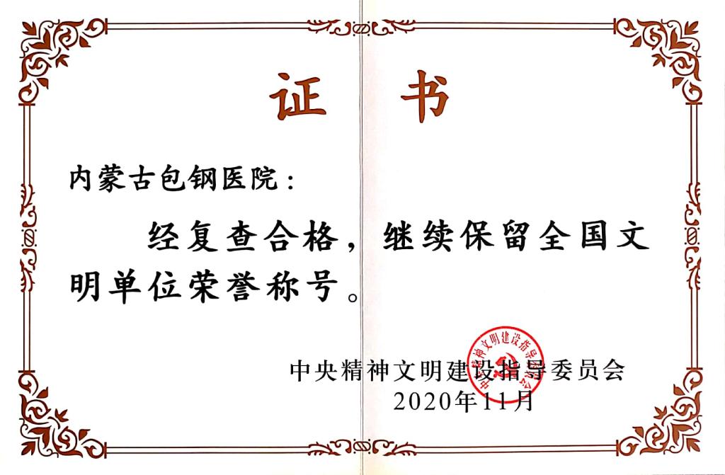 文明結碩果,續(xù)寫新篇章。近日,中央精神文明建設指導委員會印發(fā)《關于復查確認繼續(xù)保留榮譽稱號的全國文明城市、文明村鎮(zhèn)、文明單位、文明家庭、文明校園的通報》(文明委[2020]9號),我院順利通過中央文明委“全國文明單位”復查驗收,繼續(xù)保留“全國文明單位”榮譽稱號。這是我院扎實推進文明單位創(chuàng)建活動取得的豐碩成果,是全院職工團結拼搏、共同努力的結果。