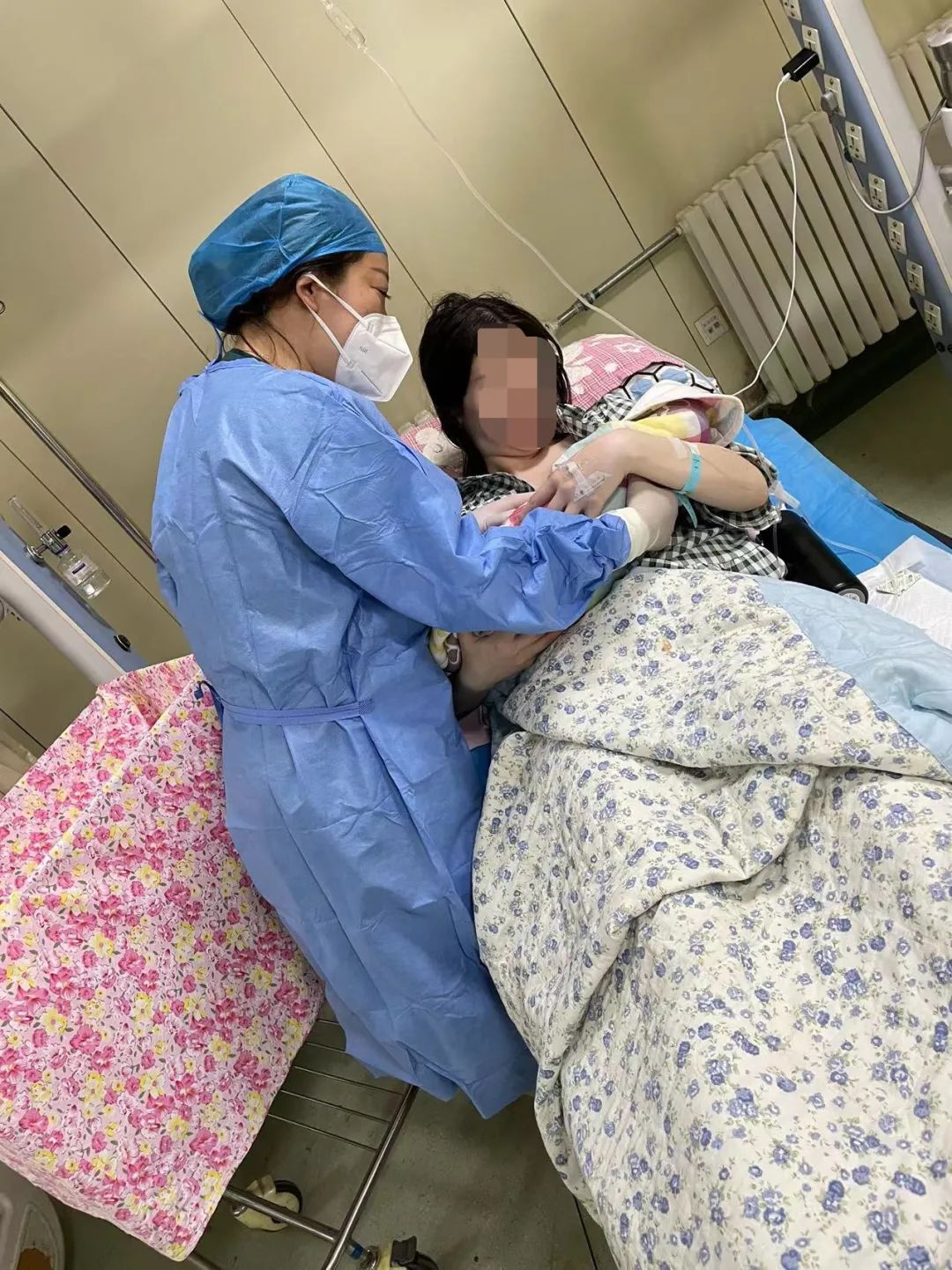 在隔離病房里生產(chǎn),對(duì)于醫(yī)護(hù)人員來說,需要穿著厚厚的防護(hù)服,行動(dòng)很不方便;而對(duì)于孕婦來說,沒有家人的陪伴,難免擔(dān)憂、焦躁。在等待分娩時(shí),因一陣陣宮縮及緊張,鄭女士有點(diǎn)發(fā)抖。婦產(chǎn)科的醫(yī)護(hù)人員便握著她的手,為她暖手、陪她聊天分散注意力。