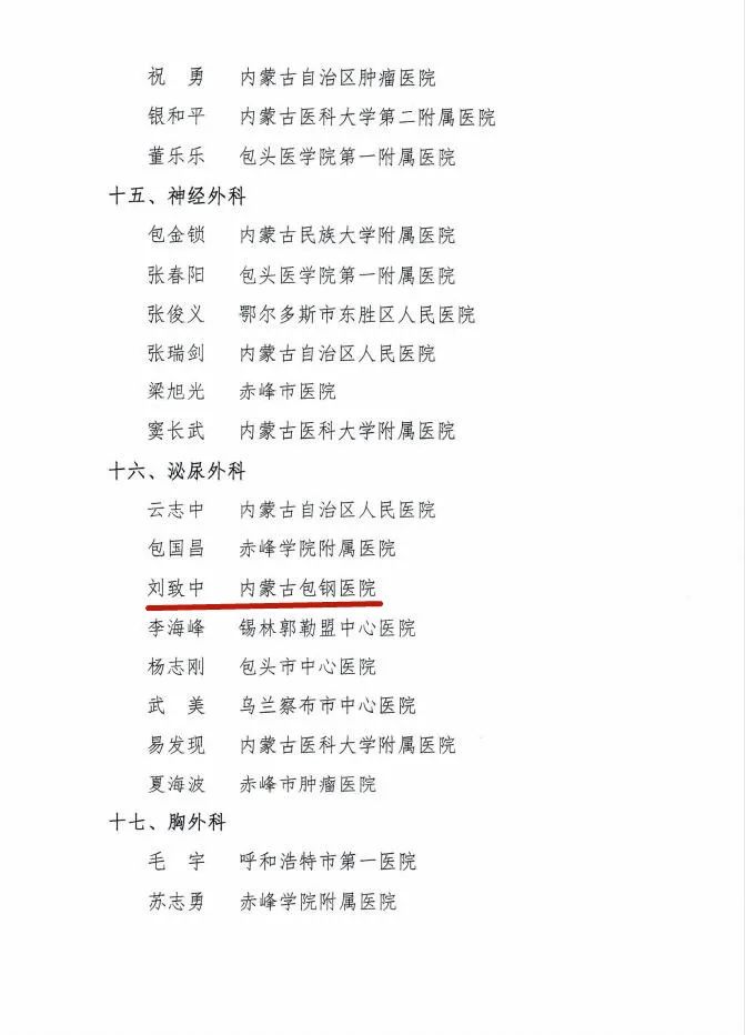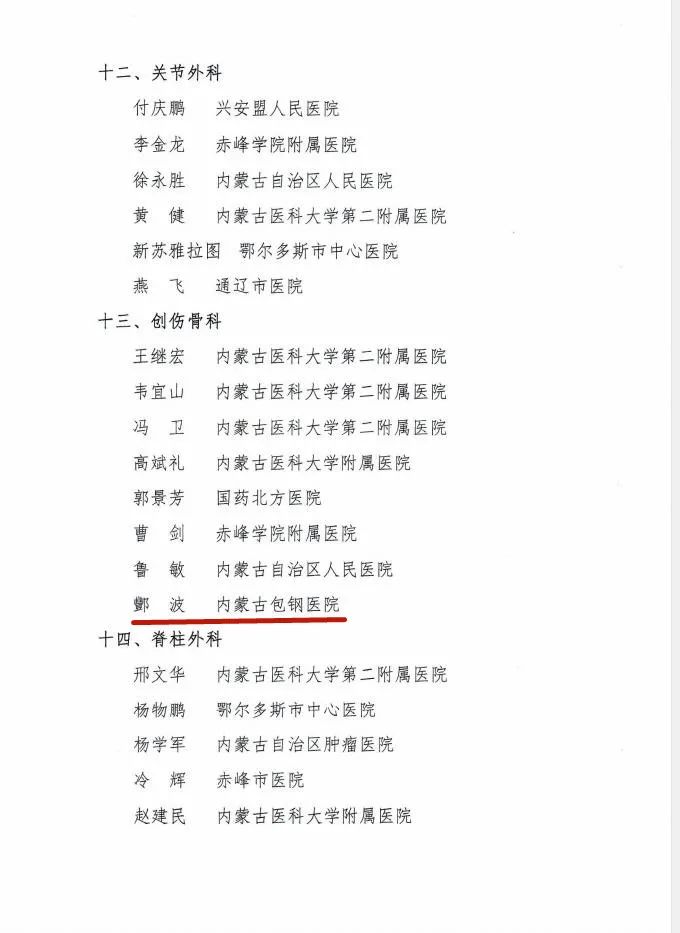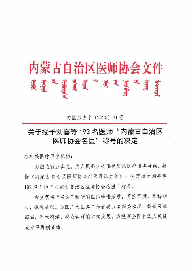 為營(yíng)造名醫(yī)輩出的良好氛圍,調(diào)動(dòng)廣大醫(yī)師的積極性和創(chuàng)造性,近日,內(nèi)蒙古自治區(qū)醫(yī)師協(xié)會(huì)決定,授予劉喜等192名醫(yī)師“內(nèi)蒙古自治區(qū)醫(yī)師協(xié)會(huì)名醫(yī)”稱號(hào)。內(nèi)蒙古包鋼醫(yī)院呼吸與危重癥醫(yī)學(xué)科主任楊敬平、普外科主任趙金、骨科醫(yī)學(xué)部主任豐波、泌尿外科主任劉致中、婦產(chǎn)科主任杜海燕、眼科主任辛向陽(yáng)獲得“內(nèi)蒙古自治區(qū)醫(yī)師協(xié)會(huì)名醫(yī)”稱號(hào)!