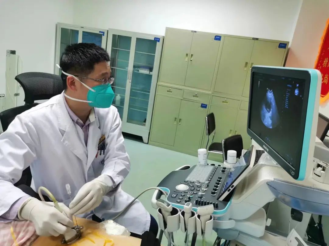 2021年夏天,一個炎熱的中午,醫(yī)院急診科收診一名車禍外傷患者。由于大量心包積液,合并急性心包填塞,患者生命體征極其不穩(wěn)定,隨時都有生命危險。進行術(shù)前探查,與臨床醫(yī)生探討安全路徑,定位,消毒,穿刺置管……劉智眼手并用,熟練完成超聲引導下心包腔穿刺置管引流。隨著引流管準確進入預(yù)定位置,血性積液緩緩流入引流袋,患者狀態(tài)逐漸趨于平穩(wěn)。參與會診的醫(yī)護人員心里懸著的石頭終了地。看到同事們肯定的笑容和患者家屬激動的表情,劉智很欣慰。那一刻,所有的付出和辛勞都是值得的。