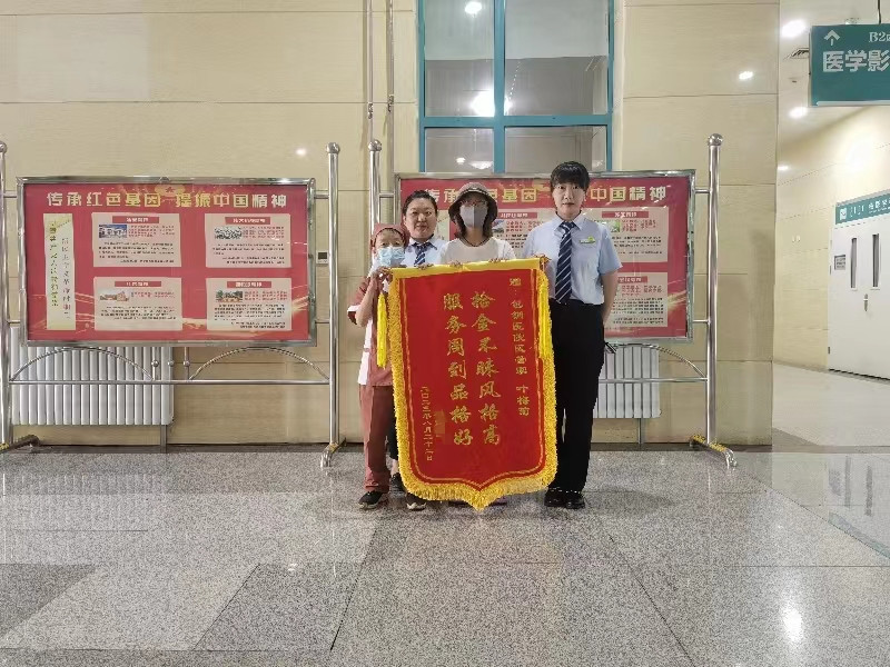 次日,深受感動的失主劉先生和家屬專程來到醫(yī)院找到葉大姐,送上定制的“拾金不昧風格高 服務(wù)周到品格好”錦旗表示感謝。