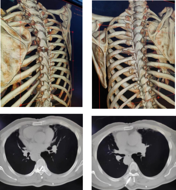 到達(dá)醫(yī)院后,急診科醫(yī)生針對張先生的情況迅速完善相關(guān)專科檢查,急請骨科醫(yī)學(xué)部張尊副主任醫(yī)師及冉博主任醫(yī)師會(huì)診,兩位醫(yī)生不到五分鐘即趕赴現(xiàn)場判斷傷情。當(dāng)時(shí)張先生后背部只見鐵釘釘帽殘留于皮外,其余部分全部刺入身體,內(nèi)部情況不明。隨即為張先生進(jìn)行胸部三維CT檢查,顯示:10公分的鐵釘自左背部刺入背部肌肉,從胸7椎板斜向內(nèi)貫通,最后止于胸8椎體,整個(gè)鐵釘牢固的插在張先生的椎管內(nèi)。