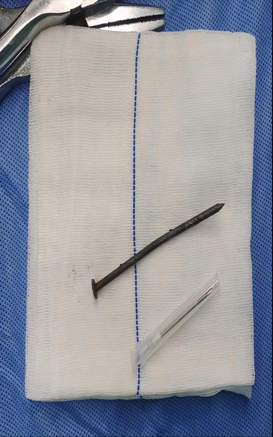 危急時(shí)刻,與患者家屬及張先生本人溝通后,醫(yī)生們決定為患者行開放性胸椎損傷異物取出術(shù),盡可能減輕患者脊柱脊髓損傷后遺癥的發(fā)生。術(shù)中冉博醫(yī)生親自操刀,在距離鐵釘釘帽內(nèi)側(cè)開口,精準(zhǔn)找到鐵釘內(nèi)部位置,觀察鐵釘走行情況,發(fā)現(xiàn)鐵釘自胸7椎板上緣刺入椎管,隨時(shí)可能發(fā)生進(jìn)一步脊髓損傷情況。患者情況危急,必須當(dāng)機(jī)立斷!拔出鐵釘時(shí),冉博醫(yī)生持鐵釘?shù)氖址€(wěn)如泰山,一邊觀察鐵釘拔出情況,一邊還需注意鐵釘尖端拔出椎體后硬脊膜漏、腦脊液外滲情況。3分鐘后,鐵釘順利拔出,未見鐵釘斷裂及體內(nèi)殘留,術(shù)后測量鐵釘長度10cm。手術(shù)15分鐘完成,患者手術(shù)蘇醒后,未有脊髓損傷加重情況,未有外傷加重情況,雙下肢活動(dòng)良好,仿若奇跡!