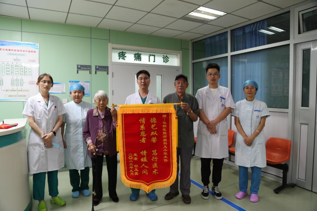 “真是太感謝疼痛科的支醫(yī)生了!醫(yī)療技術(shù)精湛、服務(wù)態(tài)度也好……”近日,內(nèi)蒙古包鋼醫(yī)院疼痛科迎來感人一幕,胡奶奶及家屬滿懷感激地把一面寫有“德藝雙馨 情系患者 篤行醫(yī)術(shù) 情暖人間”的錦旗遞到疼痛科副主任支小軍手中,以表達(dá)對疼痛科全體醫(yī)務(wù)人員的感激之情,并對他們的醫(yī)德醫(yī)術(shù)連連贊嘆!