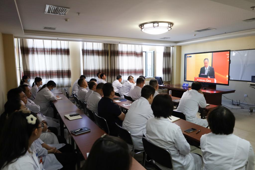 儀式后,醫(yī)院組織干部職工線上觀看了航天醫(yī)科成立5周年慶祝表彰大會暨“最美醫(yī)科人”主題宣講活動。內蒙古包鋼醫(yī)院燒傷外科主任巴特、心血管內科主任曲濤榮獲“最美醫(yī)科人”個人榮譽稱號,器官移植中心團隊榮獲“最美醫(yī)科人”集體榮譽稱號。燒傷外科主任巴特、器官移植中心團隊韓利忠在活動現(xiàn)場進行了宣講。