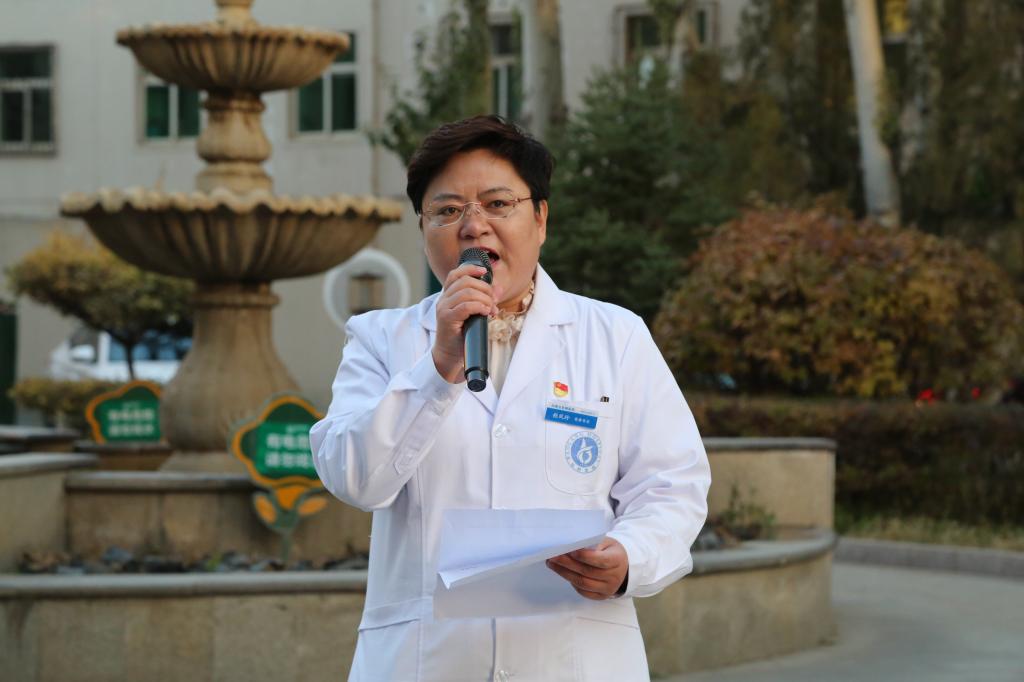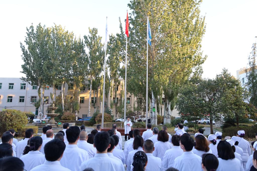 航天醫(yī)科副總經理、內蒙古包鋼醫(yī)院院長張向群在儀式上講話。航天醫(yī)科醫(yī)療總監(jiān)、內蒙古包鋼醫(yī)院黨委書記張鳳珍主持儀式。醫(yī)院領導、黨支部書記、各科室主任、護士長等共100余人參加升旗儀式。