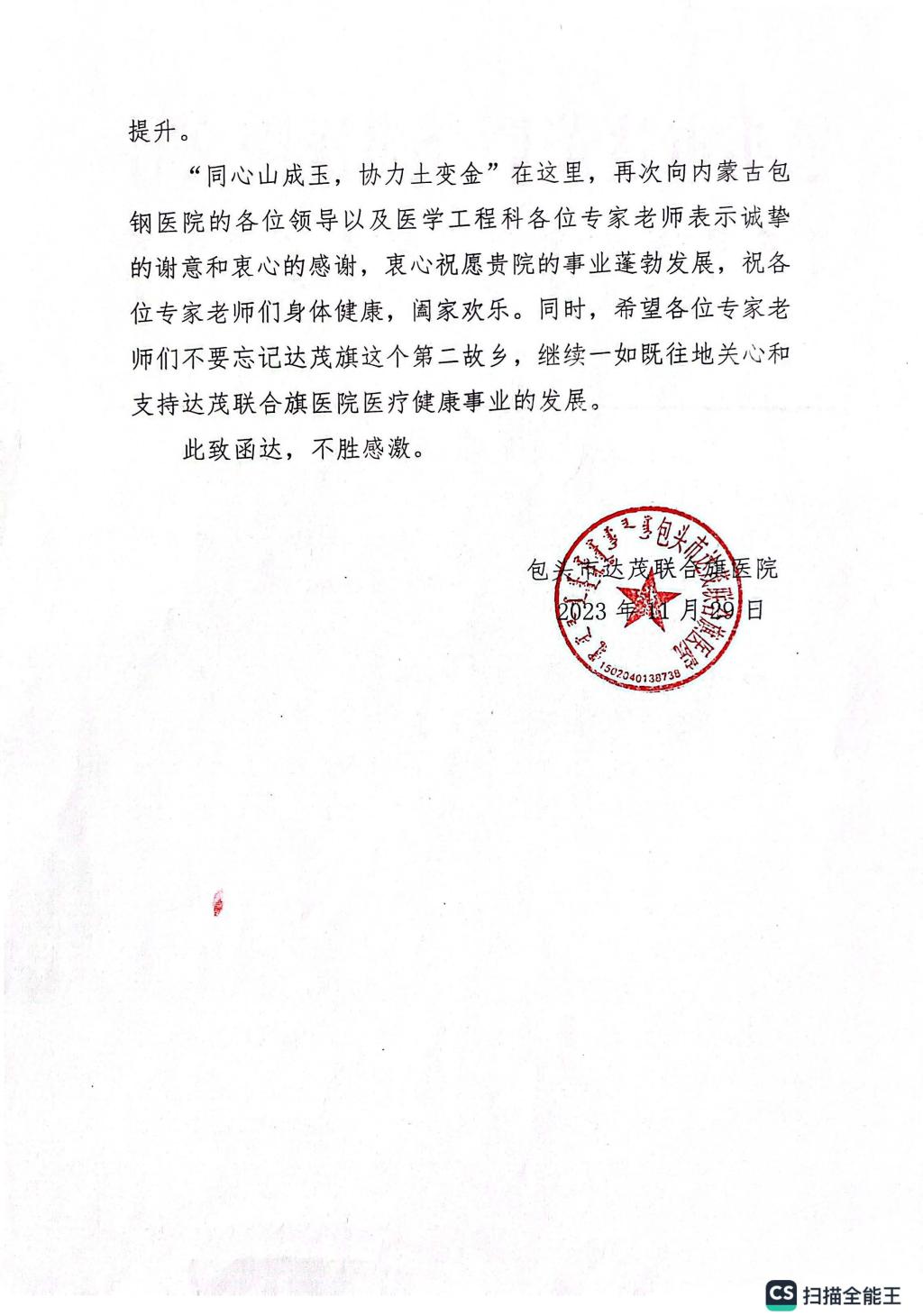 “風(fēng)雨十八載,幫扶同行路。”這封感謝信彰顯了內(nèi)蒙古包鋼醫(yī)院傾心盡力的幫扶情深和主動作為的責(zé)任擔(dān)當(dāng),也是對醫(yī)學(xué)工程科求真務(wù)實(shí)的工作態(tài)度、精湛專業(yè)的業(yè)務(wù)水平高度肯定。