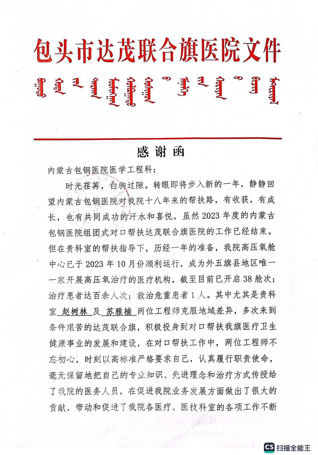 近日,內(nèi)蒙古包鋼醫(yī)院醫(yī)學(xué)工程科收到一封來自達(dá)茂聯(lián)合旗醫(yī)院的感謝信,信中對醫(yī)學(xué)工程科趙樹林和蘇雅楠兩位工程師支援幫扶工作給予充分肯定和高度贊揚(yáng),對內(nèi)蒙古包鋼醫(yī)院援助其高壓氧艙籌建表達(dá)了衷心感謝。