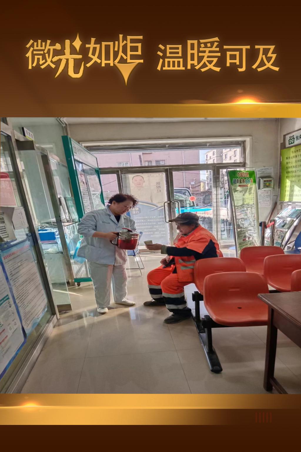 鞍山道團15南社區(qū)衛(wèi)生服務(wù)站為環(huán)衛(wèi)工人送一杯熱茶!環(huán)衛(wèi)工人丁阿姨說:“真是太暖心了,這里為我們提供熱水和休息的地方,大冷天兒干活累了,能進來坐一坐,暖和一下,太感謝了!” “這是我們該做的!”