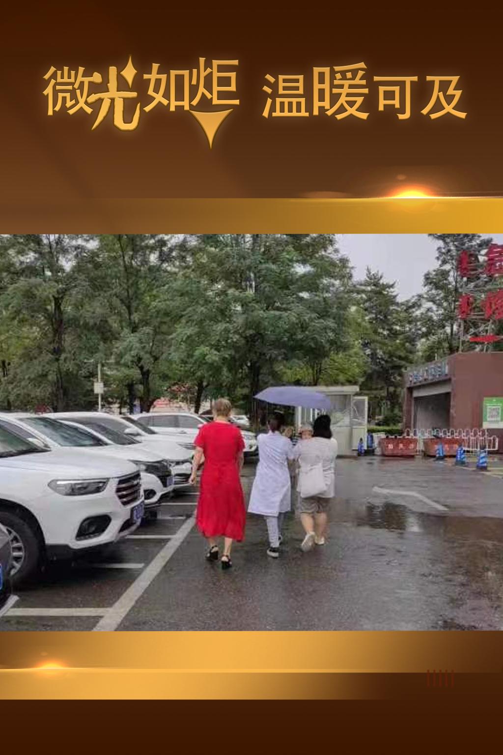 雨天,一位醫(yī)生買飯回來,看見一位婦女帶著小朋友看完病沒有帶傘,主動撐著傘護送其到私家車旁。