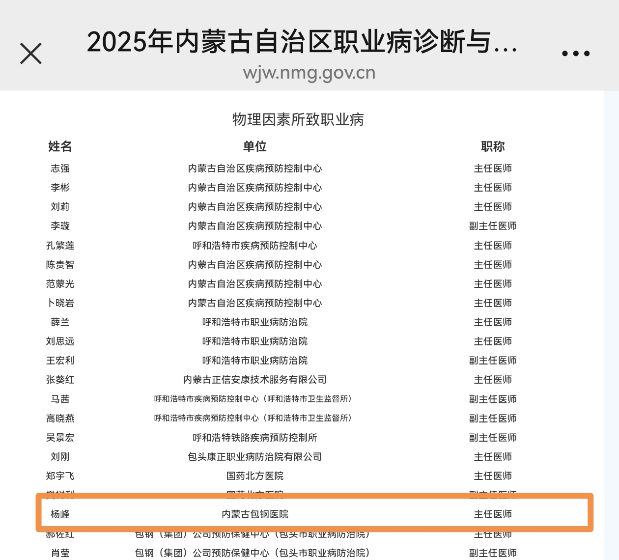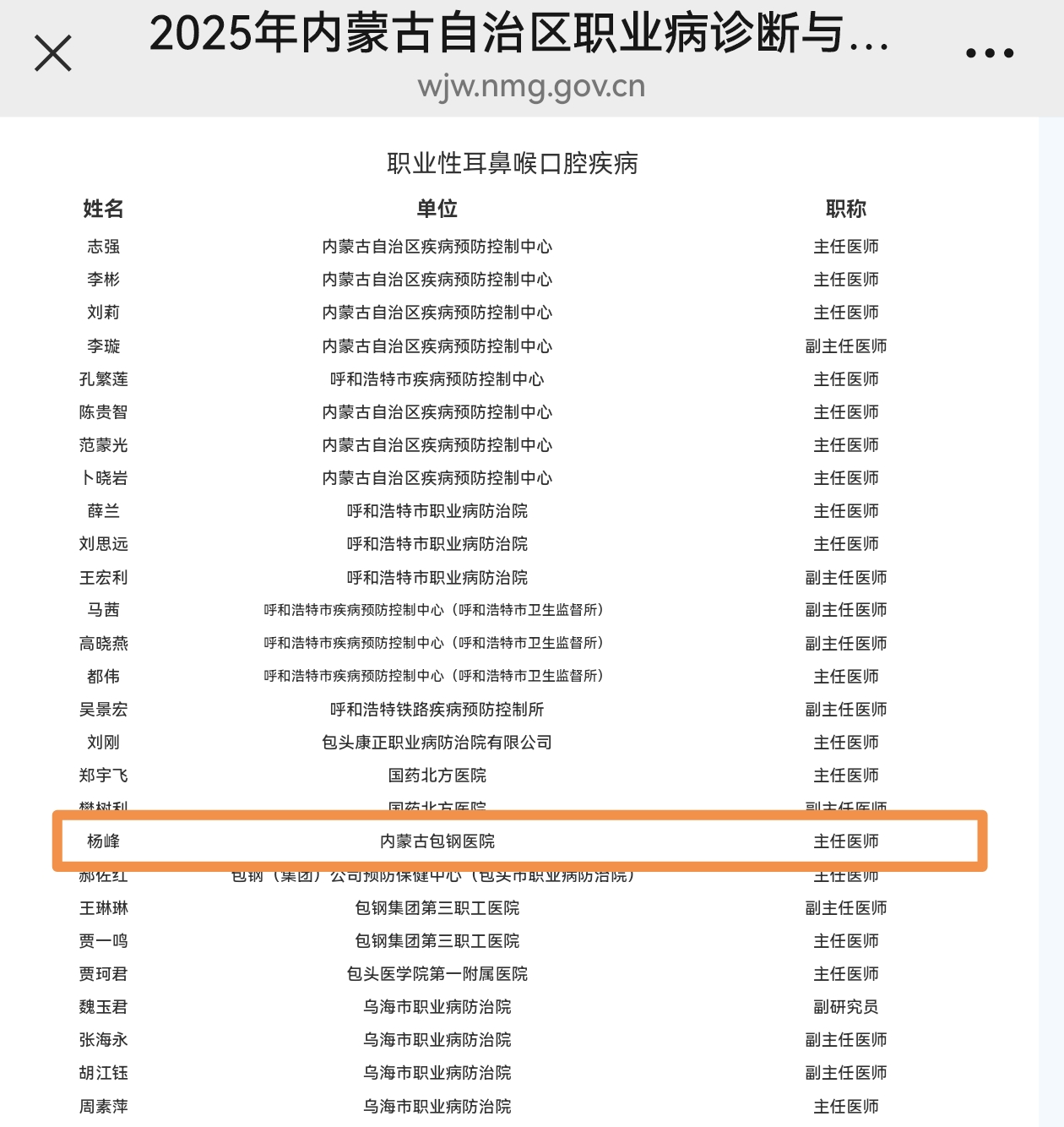 12月4日,2025年內(nèi)蒙古自治區(qū)職業(yè)病診斷與鑒定專家?guī)烀麊握焦迹瑑?nèi)蒙古包鋼醫(yī)院航天健康醫(yī)學(xué)中心職業(yè)健康主檢醫(yī)師楊峰憑借扎實(shí)的專業(yè)功底、豐富的臨床經(jīng)驗(yàn)與良好的職業(yè)素養(yǎng)成功入選,這既是對楊峰主任醫(yī)師個人專業(yè)能力的權(quán)威認(rèn)可,也是行業(yè)對醫(yī)院職業(yè)健康工作水平的高度肯定。