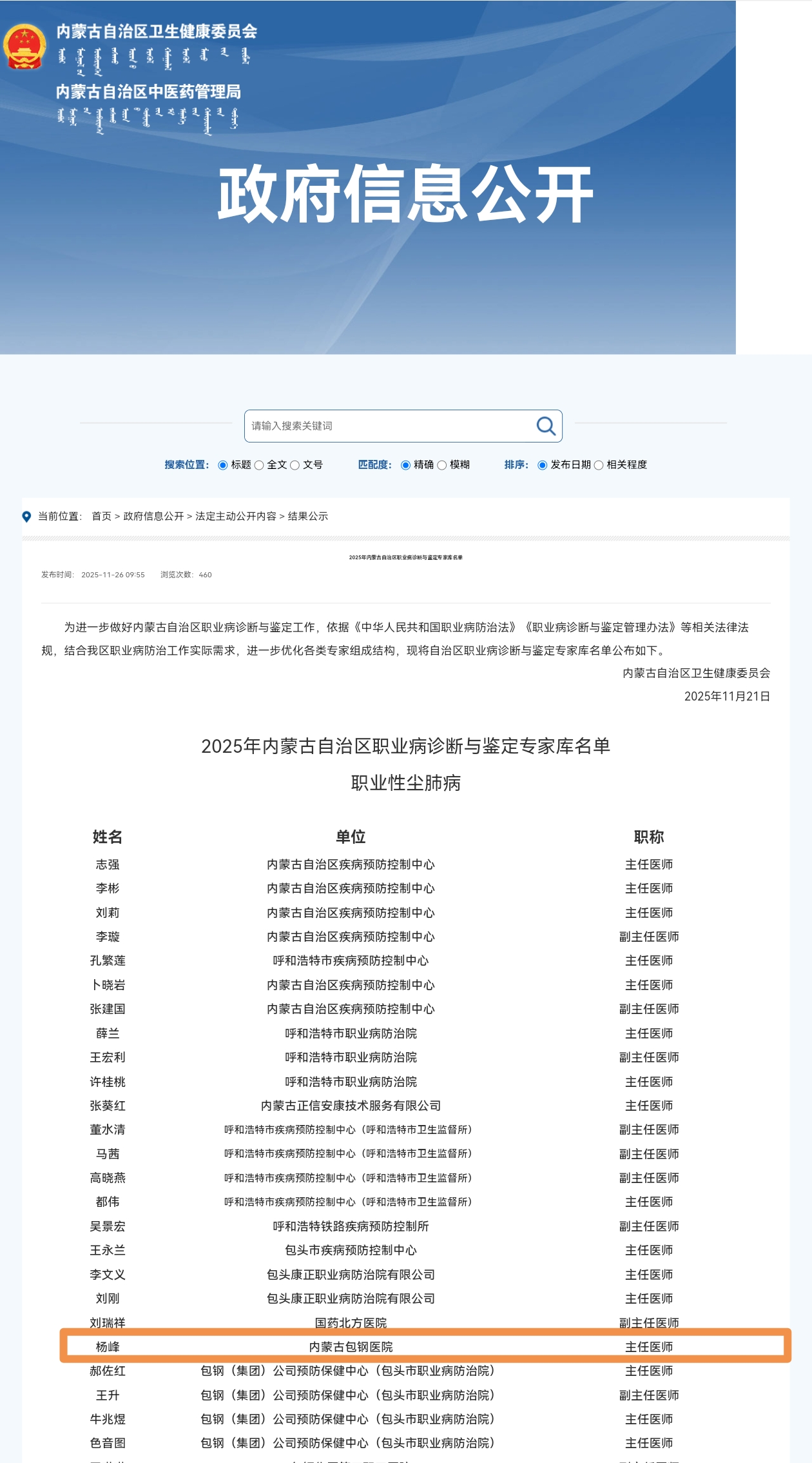 職業(yè)病診斷與鑒定專家?guī)煊蓛?nèi)蒙古自治區(qū)衛(wèi)生健康主管部門設(shè)立,成員需具備高級專業(yè)技術(shù)職務(wù)任職資格、熟悉職業(yè)病防治法律法規(guī)和診斷標(biāo)準(zhǔn)等核心條件,是保障全區(qū)勞動者職業(yè)健康權(quán)益、規(guī)范職業(yè)病診斷鑒定工作的核心技術(shù)支撐力量 。此次入選,標(biāo)志著楊峰醫(yī)師的專業(yè)能力已達(dá)到自治區(qū)行業(yè)頂尖水平,將正式以專家身份參與全區(qū)職業(yè)病診斷爭議處理、技術(shù)指導(dǎo)等重要工作,為“健康內(nèi)蒙古”建設(shè)中職業(yè)健康防線筑牢技術(shù)根基 。