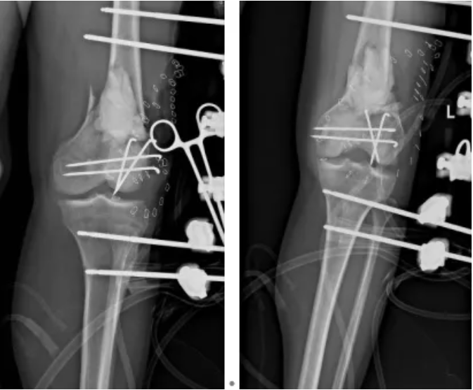“生命至上” 是救治的核心原則。醫(yī)院立即啟動多學(xué)科協(xié)作機(jī)制,骨科牽頭聯(lián)動影像科、重癥監(jiān)護(hù)室、心胸血管外科、麻醉手術(shù)科等多科室,快速制定個體化分期治療方案。到院當(dāng)晚,急診手術(shù)率先開展:對左膝部開放性傷口徹底清創(chuàng),因骨質(zhì)缺損多且污染嚴(yán)重,術(shù)中創(chuàng)新性使用抗生素骨水泥填充缺損區(qū)域,同時以外固定架臨時固定左下肢,并行右脛骨骨牽引術(shù)。