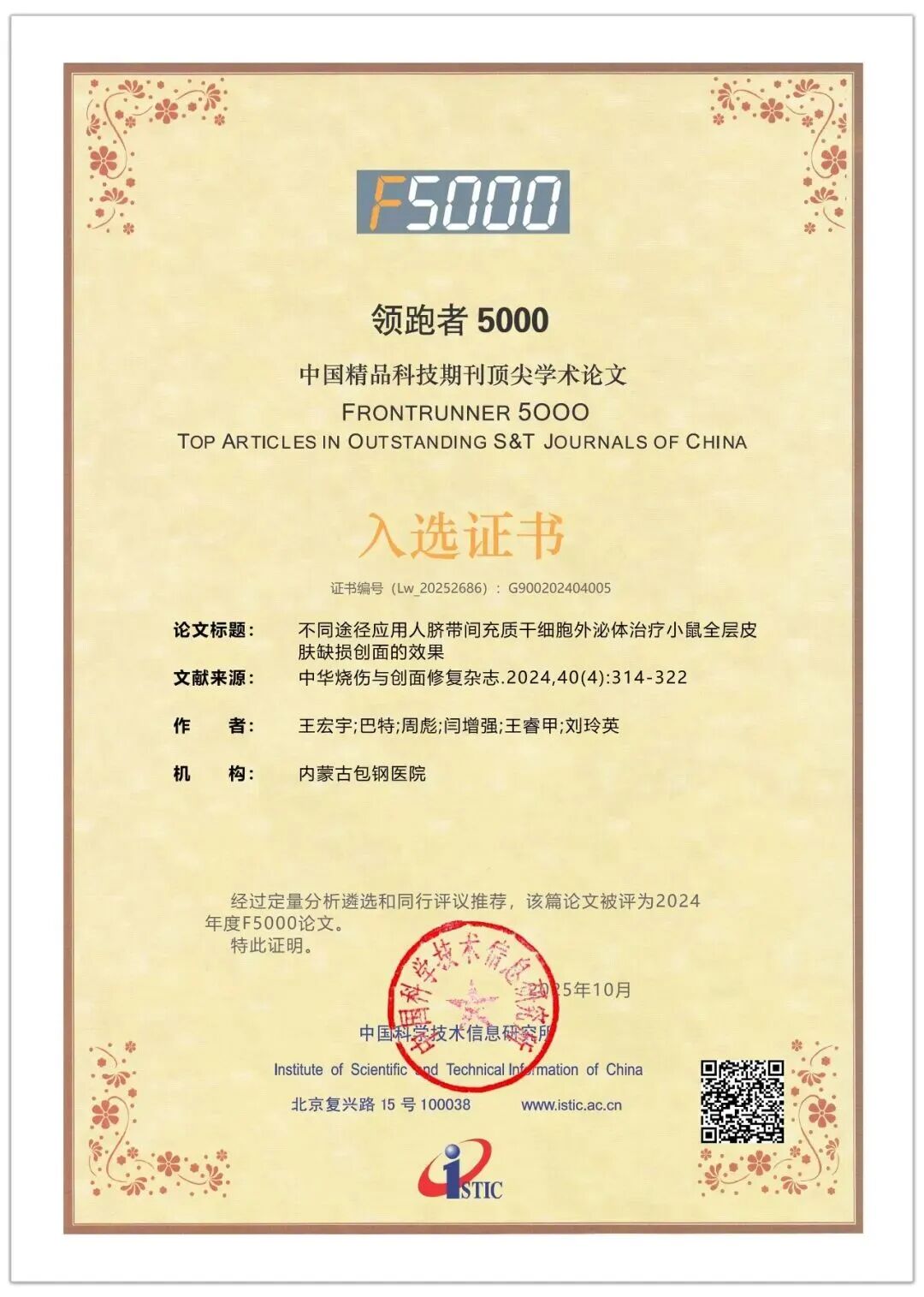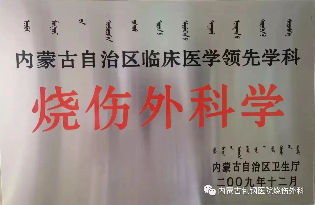 現(xiàn)為中華醫(yī)學(xué)會燒傷外科學(xué)會委員單位、中國非公立醫(yī)療機構(gòu)協(xié)會損傷與修復(fù)專業(yè)委員會副主任委員單位等26個國家級學(xué)會副主委、常委、委員單位;內(nèi)蒙古自治區(qū)醫(yī)學(xué)重點學(xué)科;包頭市醫(yī)學(xué)領(lǐng)先學(xué)科;內(nèi)蒙古自治區(qū)燒傷外科專業(yè)質(zhì)控中心;包頭市燒傷外科專業(yè)質(zhì)控中心;內(nèi)蒙古醫(yī)科大學(xué)、內(nèi)蒙古科技大學(xué)醫(yī)學(xué)院燒傷專業(yè)碩士學(xué)位培養(yǎng)點。