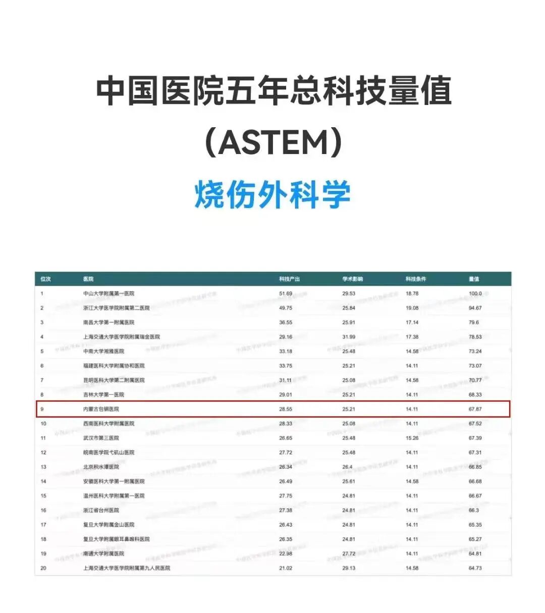 分別于2014、2015、2016、2017年入圍華北地區(qū)醫(yī)院專科聲譽排行榜前五強,是內(nèi)蒙古唯一入圍的專科;在中國醫(yī)學(xué)科學(xué)院、中國醫(yī)學(xué)科學(xué)院醫(yī)學(xué)信息研究所發(fā)布的中國醫(yī)院科技量值(STEM)年度排名中,全國燒傷外科學(xué)領(lǐng)域,內(nèi)蒙古包鋼醫(yī)院燒傷外科位列全國燒傷專科榜2016年度23名,2017年度22名,2018年度24名,2019年度10名,2020年度9名,2021年中國醫(yī)院五年總科技量值(ASTEM)排名第9名,2022年度中國醫(yī)院科技量值(STEM)排名第11名,內(nèi)蒙古地區(qū)專科第一名。2018年成為中國創(chuàng)面修復(fù)聯(lián)盟建設(shè)培育單位,該單位在中國醫(yī)師協(xié)會有備案,屬于由國務(wù)院批準的《中國創(chuàng)面修復(fù)科建設(shè)“1239”三年行動計劃》中醫(yī)療機構(gòu)認證的關(guān)節(jié)一環(huán)。2019年創(chuàng)建包頭市創(chuàng)面修復(fù)專科聯(lián)盟、內(nèi)蒙古包鋼醫(yī)院創(chuàng)面治療中心。2022年成立創(chuàng)面修復(fù)科,隸屬燒傷外科。