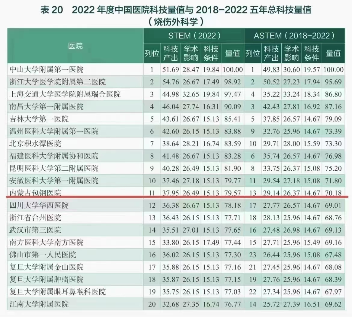7月6日,2022年度中國醫(yī)學(xué)院校/中國醫(yī)院科技量值(STEM)與2018—2022五年總科技量值(ASTEM)在北京發(fā)布。內(nèi)蒙古包鋼醫(yī)院“燒傷外科學(xué)”以單年科技量值總分79.57分,位列全國第十一,是內(nèi)蒙古自治區(qū)唯一入圍前20名專業(yè)。