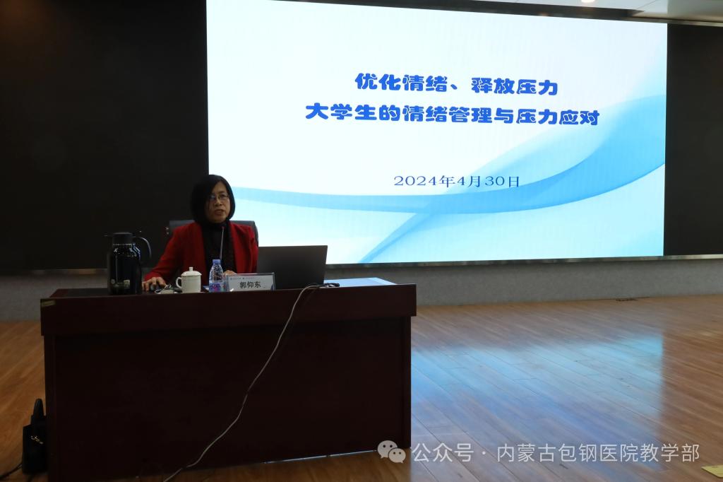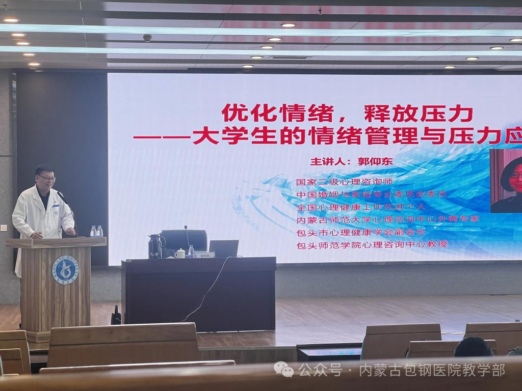為積極響應(yīng)國(guó)家衛(wèi)健委關(guān)于近期住培相關(guān)工作指示,進(jìn)一步提升我院住培學(xué)員心理健康教育工作,有效預(yù)防學(xué)員心理危機(jī)事件,保障規(guī)范化培訓(xùn)工作有序進(jìn)行,同時(shí),為了更好幫助學(xué)員排解伴隨著我院2020級(jí)本科生水平測(cè)試、2021級(jí)住培結(jié)業(yè)考試到來(lái)的學(xué)習(xí)壓力,我院于4月30日在門診九樓多功能報(bào)告廳,舉辦了“優(yōu)化情緒,釋放壓力”心理健康講座。本次講座特別邀請(qǐng)了國(guó)家二級(jí)心理咨詢師、全國(guó)心理健康工作先進(jìn)個(gè)人、包頭市心理健康學(xué)會(huì)副會(huì)長(zhǎng)、包頭師范學(xué)院心理咨詢中心郭仰東教授授課。院黨委副書記、紀(jì)委書記傅冠峰,教學(xué)部部長(zhǎng)李強(qiáng),副部長(zhǎng)平俐,住培生、專碩研究生、本科生200余人參加,講座由李強(qiáng)部長(zhǎng)主持。