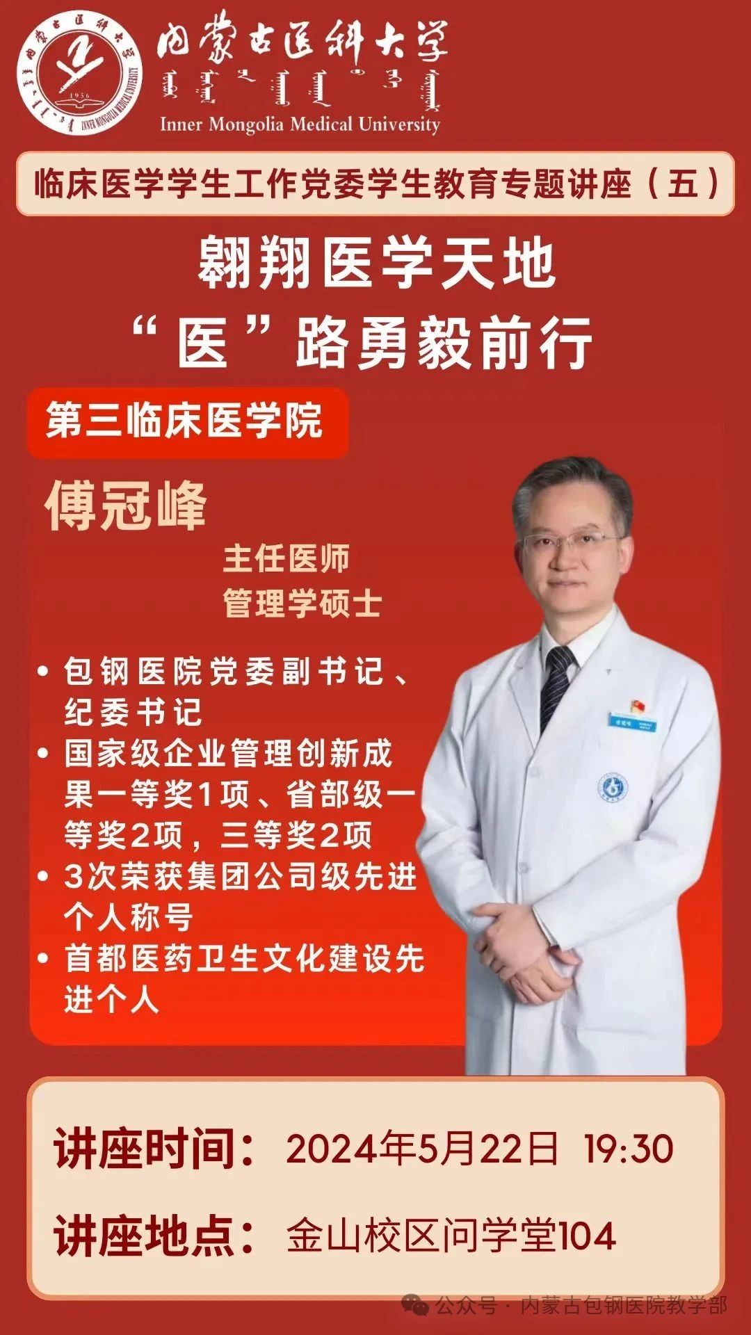 為進(jìn)一步加強(qiáng)學(xué)校、學(xué)院學(xué)風(fēng)建設(shè),提高同學(xué)們對(duì)所學(xué)專業(yè)及行業(yè)的認(rèn)識(shí),科學(xué)規(guī)劃大學(xué)的學(xué)習(xí)生活和努力方向,按照內(nèi)蒙古醫(yī)科大學(xué)臨床醫(yī)學(xué)學(xué)生工作黨委有關(guān)安排,5月22日,內(nèi)蒙古包鋼醫(yī)院黨委副書記、紀(jì)委書記傅冠峰為校本部(內(nèi)蒙古醫(yī)科大學(xué)金山校區(qū))學(xué)生開展題為“翱翔醫(yī)學(xué)天地,‘醫(yī)’路勇毅前行”的專題講座,本場講座由內(nèi)蒙古包鋼醫(yī)院(第三臨床醫(yī)學(xué)院)學(xué)生工作科長、教學(xué)部副部長劉彤主持。