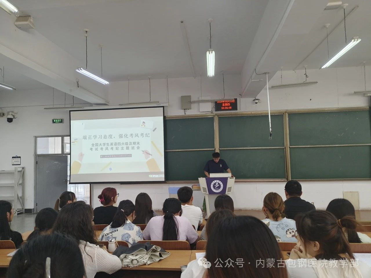 6月13日在內(nèi)蒙古醫(yī)科大學(xué)金山校區(qū)北樓102教室開展了“端正學(xué)習(xí)態(tài)度,強化考風(fēng)考紀(jì)”全國大學(xué)生英語四六級及期末考風(fēng)考紀(jì)主題班會,全體在校學(xué)生參加。輔導(dǎo)員老師詳細(xì)介紹了內(nèi)蒙古醫(yī)科大學(xué)關(guān)于考試違紀(jì)行為的認(rèn)定與處分,使同學(xué)們對于考試違規(guī)行為的后果有了更深刻的認(rèn)識,進一步樹立了同學(xué)們誠信應(yīng)考意識,塑造誠信品質(zhì),弘揚誠信之風(fēng),樹立正確的學(xué)習(xí)觀和價值觀,為大學(xué)生活寫下一篇篇誠實篇章。