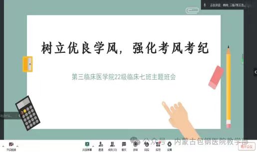 6月22日以騰訊會議的形式組織學(xué)生線上開展主題班會。班主任韓帥老師提醒同學(xué)們在期末考試期間要時刻牢記考試紀(jì)律,遵守考試規(guī)定,端正考試態(tài)度,充分把握復(fù)習(xí)時間,以誠信的態(tài)度對待每一場考試,以實力爭取優(yōu)異成績,以誠信展現(xiàn)良好學(xué)風(fēng)。